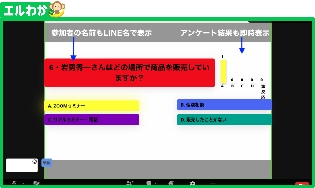 Zoom画面上に、ボタン型質問を表示できるから、参加者は気軽にそれを”押すだけ”。クイズ番組感覚で、自然と参加型Zoomセミナーになっていきます。