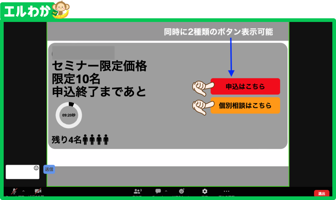 緊急性・限定性を取り入れた表示が可能。Zoom画面上でのセールス時に『今から10分以内』や『限定10名』という表示ができ、それぞれカウントダウン表示も可能だから、購入促進を加速させることができます。